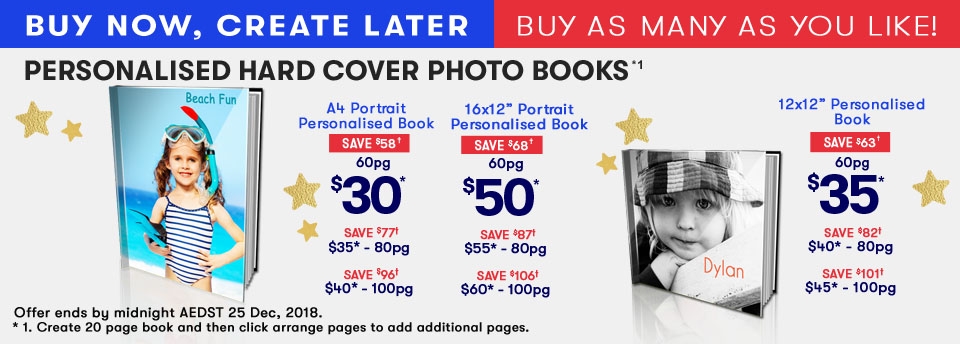 BIG W Photos Terms and Conditions: Buy Now Create Later offer ends midnight AEDST 25 December 2018, and voucher code must be purchased by midnight AEDST 25 December, 2018. You can become a member of BIG W Photos by clicking 'Register' and entering the requested information. The voucher code is valid for 3 months from midnight AEDST 25 December, 2018, and the Photo Book order must be finalised by midnight AEDST 25 March, 2019 when the voucher code will expire. Only one voucher code can be used for each order. If you wish to order multiple Photo Books you must purchase a separate voucher code for each order and delivery charges apply for home delivery for each order. If the voucher code has not been redeemed by midnight AEDST 25 March 2019 the code will convert into a gift card and be used towards the purchase of any product on the BIG W Photos site for 3 Years ending on midnight AEDST 25 March 2022. At the end of the 3 Year period, the gift card will expire. *1. Create 20 page book then click arrange pages to add the additional pages. No delivery charges apply when in store pickup is selected. All orders must be finalised in a single transaction. †Saving is based on the regular BIG W price and does not apply to home delivery charges. *Prices do not include delivery charges which are additional when home delivery is selected. Standard delivery charges of $6.95 for the first Photo book ordered and $1.95 for each additional Photo Book delivered within Australia or $69.95 for the first item and $9.95 for each additional item for orders delivered outside Australia apply when home delivery is selected. Terms of BIG W Photos Online apply, view them at www.bigwphotos.com.au