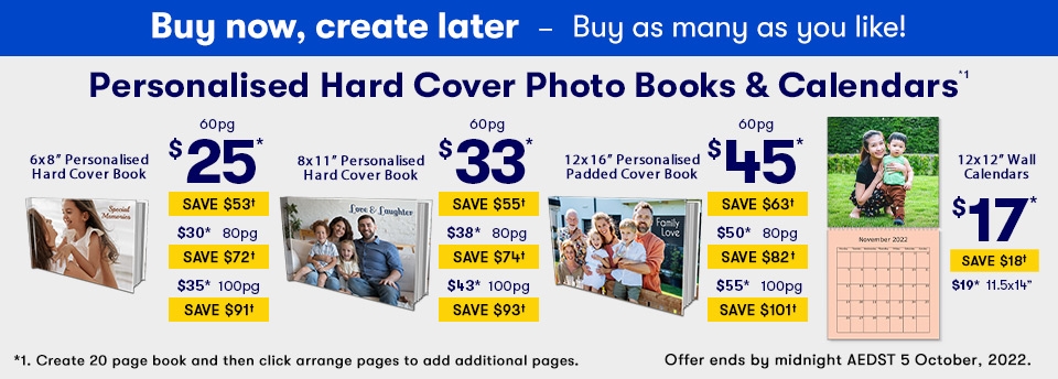 BIG W Photos Terms and Conditions: Buy Now Create Later offer ends midnight AEDST 5 October 2022, and the voucher code must be purchased by midnight AEDST 5 October 2022. You can become a member of BIG W Photos by clicking 'Register' and entering the requested information. The voucher code is valid for 3 months from midnight AEDST 5 October 2022, and the order must be finalised by midnight AEDST 5 January 2023 when the voucher code will expire. Only one voucher code can be used for each order. If you wish to order multiple Photo Books you must purchase a separate voucher code for each order and delivery charges apply for home delivery for each order. If the voucher code has not been redeemed by midnight AEDST 5 January 2023, the code will convert into a gift card and be used towards the purchase of any product (excluding for the purchase of Buy Now Create Later codes) on the BIG W Photos site for 3 Years ending on midnight AEDST 5 January 2026. At the end of the 3 Year period, the gift card will expire. *1. Create your standard 20 page book & add the additional pages in the design screen. No delivery charges apply when in store pickup is selected. All orders must be finalised in a single transaction. †Saving is based on the regular BIG W price and does not apply to home delivery charges. *Prices do not include delivery charges which are additional when home delivery is selected. Delivery charges can be found here: https://www.bigwphotos.com.au/pages/delivery-information. You're receiving this email because you are subscribed to marketing communications from Big W Photos operated by FUJIFILM Australia Pty Ltd. Terms of BIG W Photos Online apply, view them at www.bigwphotos.com.au