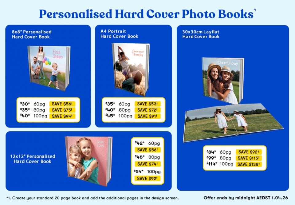 BIG W Photos Terms and Conditions: Buy Now Create Later offer ends midnight AEDST 1 April 2026, and the voucher code must be purchased by midnight AEDST 1 April 2026. You can become a member of BIG W Photos by clicking 'Register' and entering the requested information. The voucher code is valid for 3 months from midnight AEDST 1 April 2026, and the order must be finalised by midnight AEST 1 July 2026 when the voucher code will expire. Only one voucher code can be used for each order. If you wish to order multiple Photo Books you must purchase a separate voucher code for each order and delivery charges apply for home delivery for each order. If the voucher code has not been redeemed by midnight AEST 1 July 2026, the code will convert into a gift card and be used towards the purchase of any product (excluding for the purchase of Buy Now Create Later codes) on the BIG W Photos site for 3 Years ending on midnight AEST 1 July 2029. At the end of the 3 Year period, the gift card will expire. *1. Create your standard 20 page book & add the additional pages in the design screen. No delivery charges apply when in store pickup is selected. All orders must be finalised in a single transaction. †Saving is based on the regular BIG W price and does not apply to home delivery charges. *Prices do not include delivery charges which are additional when home delivery is selected. Delivery charges can be found here: https://www.bigwphotos.com.au/pages/delivery-information. You're receiving this email because you are subscribed to marketing communications from Big W Photos operated by FUJIFILM Australia Pty Ltd. Terms of BIG W Photos Online apply, view them at www.bigwphotos.com.au